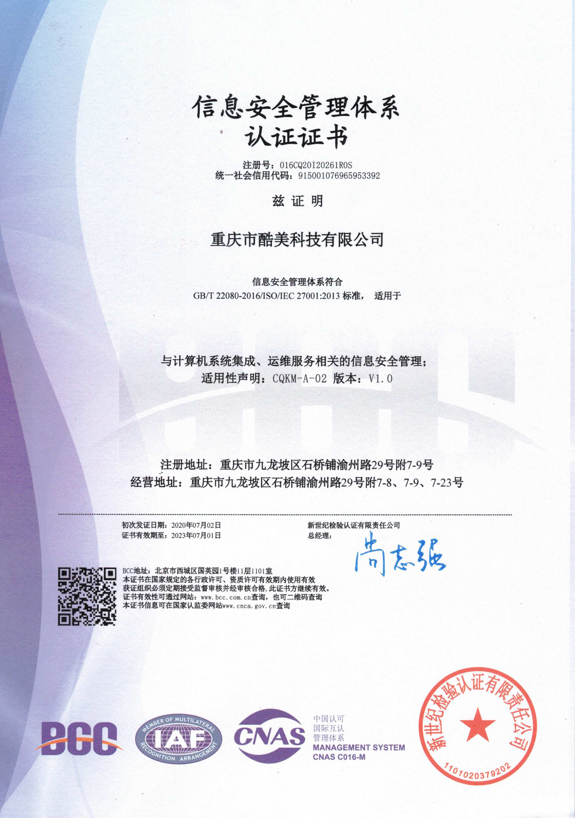 2020年₹ φ(nián)7月(yuè)2日(rì),重慶尊華科技↑≠®÷有限公司(簡稱:酷美(měi)科(kē)技(jì))正₽∑↓×式通(tōng)過GB/T 22080-2016/ISO/IE★₹$♣C 27001:2013信息安全管理(lǐ)體(tǐ)系認證,這('©≤±zhè)意味著(zhe)酷美(měi)科(kē∞≤)技(jì)的(de)信息安全管理(lǐ)體(tǐ)≥×®系達到(dào)了(le)國(guó)際标準ε®β↕,獲得(de)國(guó)際認可(kě),酷美(měi)科(kē)技(jì♠±φ®)的(de)信息安全服務能(néng)力邁♣∞上(shàng)了(le)新台階,彰顯了(le)酷美(m≥ε ěi)科(kē)技(jì)團隊在運營、管理(lǐ)、服$<務等環節高(gāo)質量的(de)服務水(shuǐ)準。