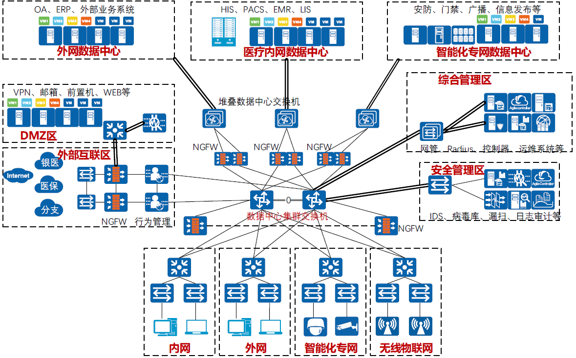 - 安全域:按照(zhào)醫(yī)院數(shù₽<±)據中心應用(yòng)系統信息和(hé)應用(y÷≤òng)分(fēn)類的(de)安全需求,數(shù)據中心網絡業(yè)務內β÷(nèi)容不(bù)同,劃分(fēn)為(wèi)內(nèi)網數(shù)σ•σ據中心、外(wài)網數(shù)據中心、智能(néng)化(huà)專網£₩數(shù)據中心、DMZ 區(qū)、對(§€duì)外(wài)互聯區(qū)、安全管理(lǐ)區(qū)以及綜合¶≠管理(lǐ)區(qū) 7 個(gè)不(bù)同的(de)安全®δ域。