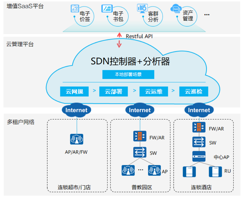 - 多(duō)租戶網絡:由包含AP、交換機(jī)、防火(huǒ)牆和(héδ♦)AR路(lù)由器(qì)等不(bù)同類型ε"網絡設備組成,部署在客戶側,提供用(yòng)戶接入★✔↕。
